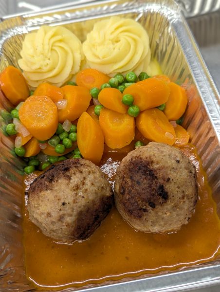 Balletjes in tomatensaus – wortelen en erwten – puree